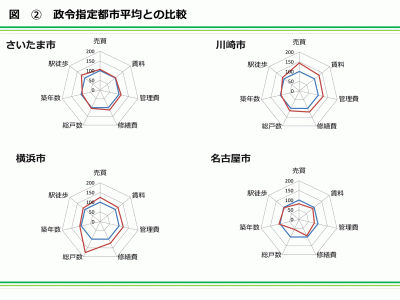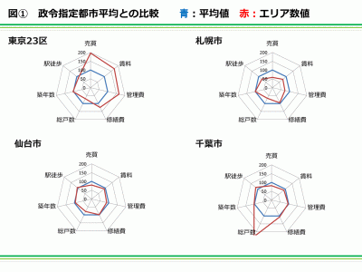 ここでは、青線が平均値=100、赤い線がそのエリアの分譲マンション(販売されているもの)の平均値となる。