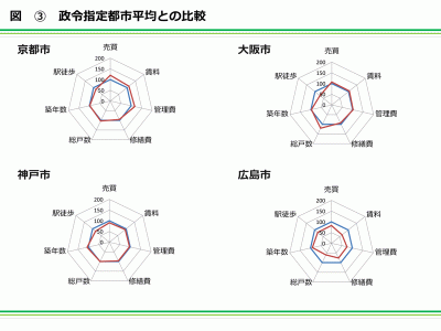 一方、概ね各要素が平均を下回るのは、札幌・仙台・広島・福岡という地方の大都市が並ぶ。これらは、順当な感じだ。3大都市に比べて地価が安く、物価も安い。また、マンションが増え始めたのも大都市圏に比べて遅かったから、築年数も浅い。