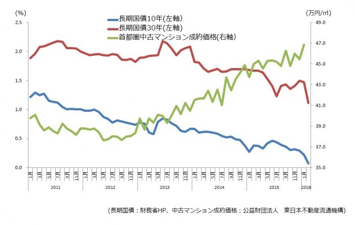 ここで、住宅ローン金利に影響がある長期国債10年もの、30年ものの金利推移と首都圏におけるマンション価格の関係を見てみよう。